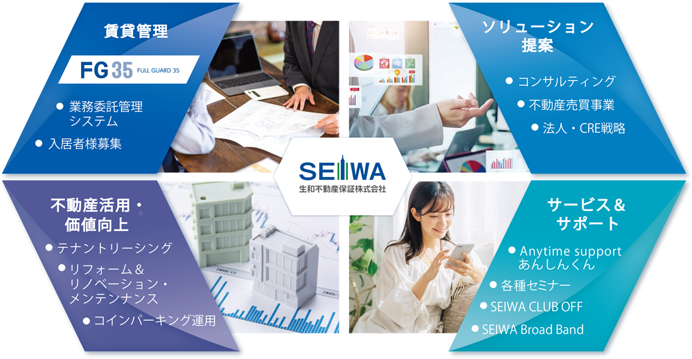 弊社は、生和グループの一翼を担う中核企業として、主にサブリース事業を中心とした賃貸不動産の運営・管理に関する様々なサービスを提供しています。不動産を有効活用するためには、市場環境やトレンド、立地特性などあらゆる角度からの分析と戦略が必要です。私たちは、「不動産のプロフェッショナル集団」として、常にステークホルダー皆様の視点に立ちながら、収益の最大化、ニーズに合わせた最適なサービスの提供をお約束いたします。「すべては、お客様のために」という理念のもと、オーナー様やご入居いただくお客様の多様なニーズに高次元でお応えできるよう、顧客本位のきめ細かなオンリーワンサービスを磨き続けてまいります。