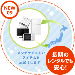 「新生活はやはり新品で」「短期だから中古で安く済ませたい」といったお客さまにもご満足いただける様、 新品と中古両方のアイテムを揃えております。もちろん、新品と中古が混在しても問題ありません。ご自由に組み合わせてレンタルすることができます。